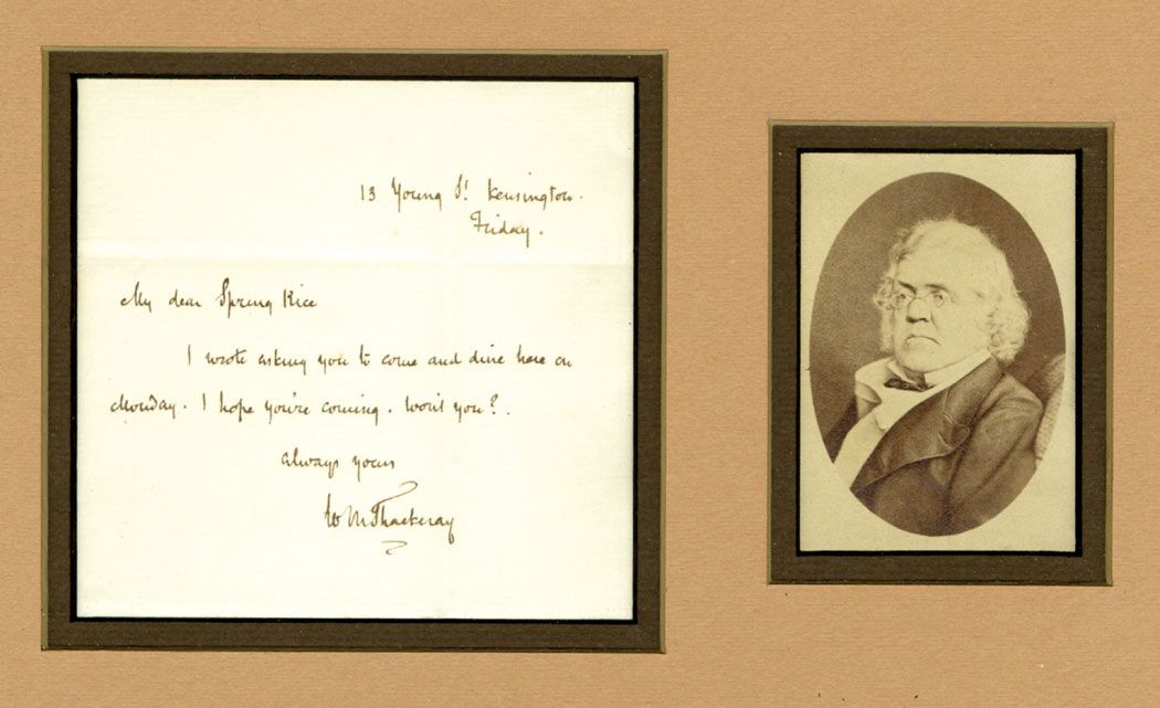 Kensington (Gardens, London, England. ND (ca.1830-50's), Short note to "Spring Rice" about dining date. William Makepeace Thackeray was an English novelist of the 19th century. He was famous for his satirical works, particularly Vanity Fair, a panoramic portrait of English society. XF condition and framed under glass.