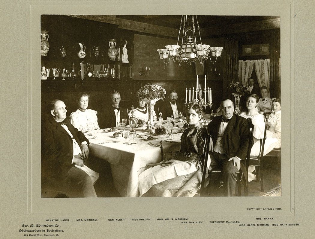 Cleveland, Ohio, ND (ca.1890's), 9.5 x 7 inches, horizontal, photograph mounted on photographers mount with photographers credit " Geo. M. Edmonson Co., McKinley is sitting at dinner table with his wife and numerous guests with all of their names listed at the bottom margin. Outer edges somewhat toned as well as a minor corner chip on the upper right corner. Sharp and clear photograph of future president. XF condition.