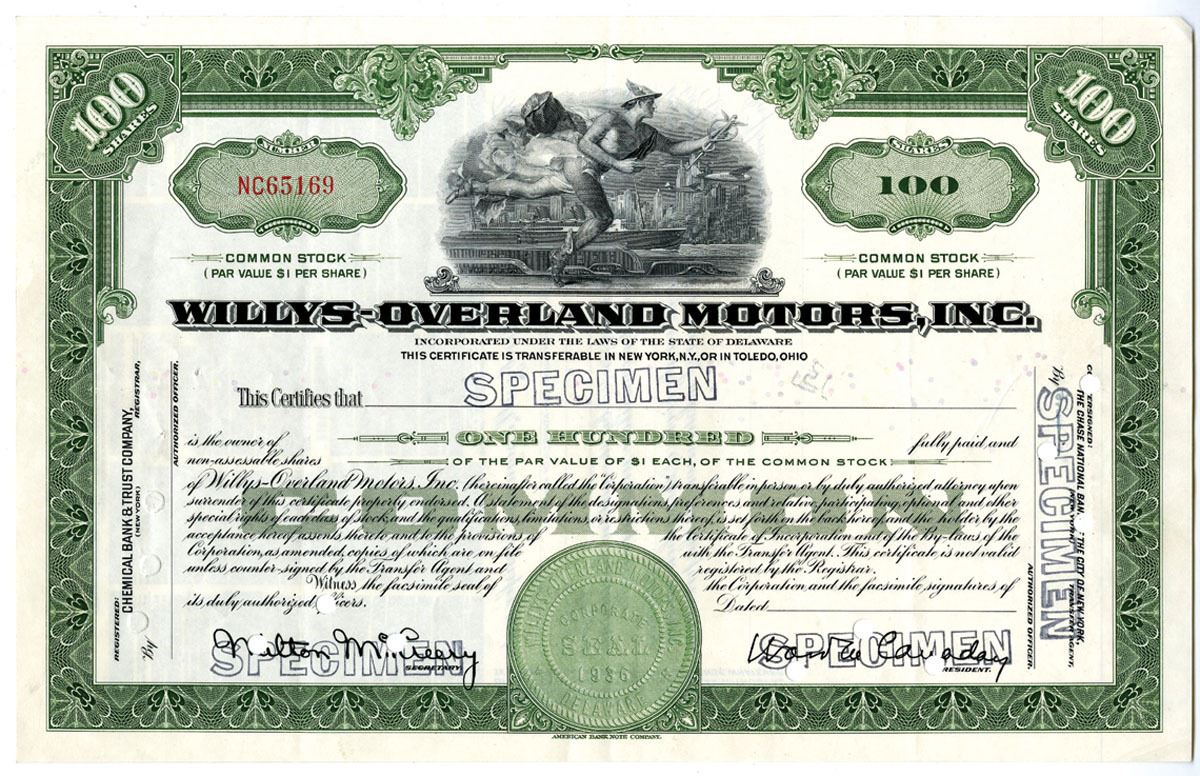Delaware, ca. 1920-40s. 100 Shares Specimen Stock Certificate, Black text with green border and underprint, Allegorical Hermes in flight at top center. Specimen overprints, POCs. XF condition, ABNC. In 1908, John Willys bought the Overland Automotive Division of Standard Wheel Company and in 1912 renamed it Willys–Overland Motor Company. From 1912 to 1918, Willys was the second-largest producer of automobiles in the United States after Ford Motor Company.