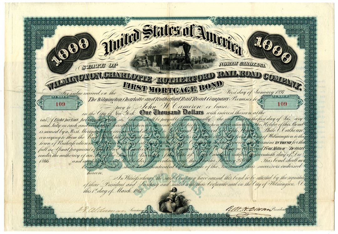 Wilmington, NC. 1867, I/C $1000, 1st Mortgage, 2nd Series 8% Coupon Bond, Black on green border and underprint, Train at station on top middle, seated allegorical woman at bottom, horizontal format, POC's, S/N 109, VF condition, National BNC.