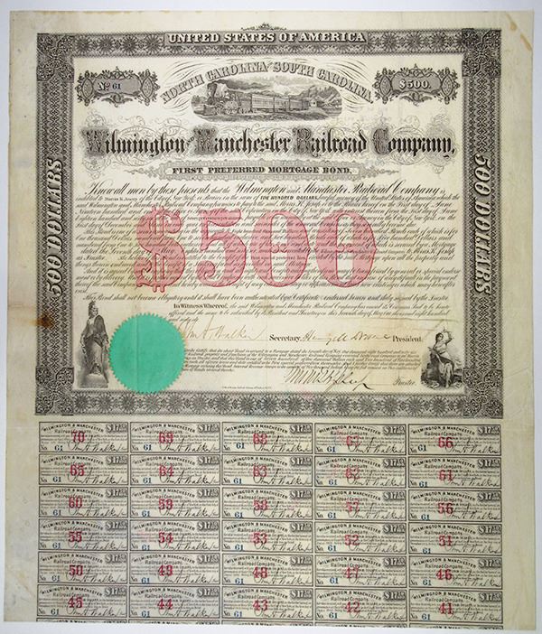 North Carolina; South Carolina. $500, bond, passenger train r-l, Columbia, Justice, 1st preferred mortgage, bearer coupon, 7%, 35-yr, 1866, due 1901, by Sei&B, s/b Morris K Jesup, trustee.