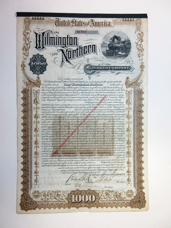 Delaware, 1892, $1000, #816, issued and lightly cancelled, EF. Signed by Henry Algernon Du Pont, U. S. Senator and Medal of Honor winner, as President. He was the grandson of the founder of E. I. du Pont de Nemours and Company.