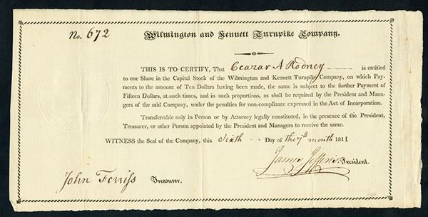Wilmington and Kennett Turnpike Co.. 1 Shares Capital Stock Issued Certificate, Black print on black border on yellow paper, Company title at top, VF-XF condition with stains along margins.