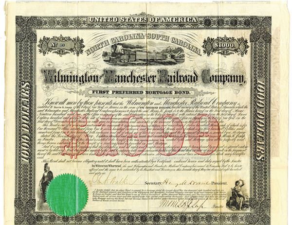 North Carolina & South Carolina. $1000 7% 1st Preferred Mortgage Coupon Bond, Black print on black border and red under tint and green seal at bottom left corner, Locomotive at top and allegorical women at the bottom, S/N 50. Fine-VF condition, Lith. Of Henry Seibert & Bros.