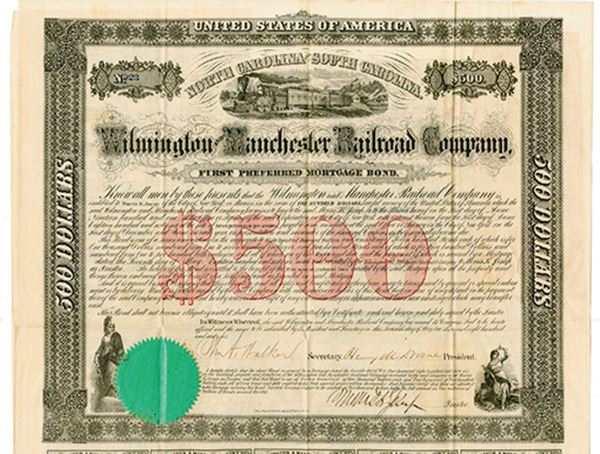 North Carolina & South Carolina. $500 Issued 7% 1st Preferred Mortgage Coupon Bond, Black print on ornate black border with red under tint, Image of locomotive at top above ornate company title, VF-XF condition, Henry Seibert & Bros. Signed by Morris K. Jessup as trustee. Jessup was a merchant, banker, and philanthropist. One of original founders of YMCA. He helped incorporate American Museum of Natural History in NYC.