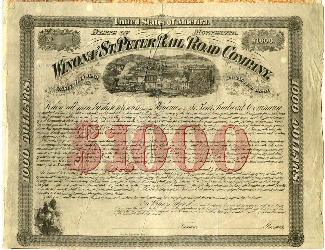 Minnesota, 1867. $1000 Unmarked Specimen 7% Sinking Fund Coupon Bond, Black text with black border and red underprint, Scene of a train passing though a town at top center. Fine to almost VF condition with folds, small tears at bottom and excess paper sides not into design. Lith. Of Henry Seibert & Bros. Rare bond in Cox, only listed as an unmarked specimen.