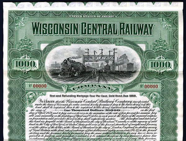 Wisconsin. 1909. $1000 1st and Refunding Mortgage 4% Specimen Bond. Black print with green border and underprint. Locomotive at railway yards with workers. POC's and red SPECIMEN overprints. VF-XF condition. ABNC. Listed railroad but unlisted bond in Cox.