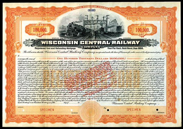 Wisconsin. 1909. $100000 Registered 1st and Refunding 4% Gold Specimen Bond. Black print with orange border and underprint. Locomotive approaching at railway yards with workers beside it. POC's and red SPECIMEN overprints. VF-XF condition. ABNC. Listed railroad but unlisted bond in Cox.