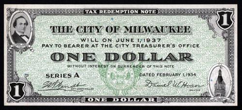Milwaukee, Wisconsin, 1934, $1, Series A, Depression Scrip note, black on light green, Juneau on top left, City Hall on lower right, with arms in underprint, back with information on the note. Choice Uncirculated. Scarce and attractive note in high grade.