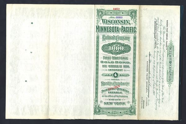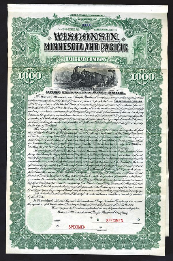 Minnesota. $1000 Specimen 4% 1st Mortgage Gold Coupon Bond. Black print on a large/ornate green border and under tint, locomotive passing station at top, Specimen overprints, POC's, VF-XF condition. FLBNC. Unlisted color variety on Cox.