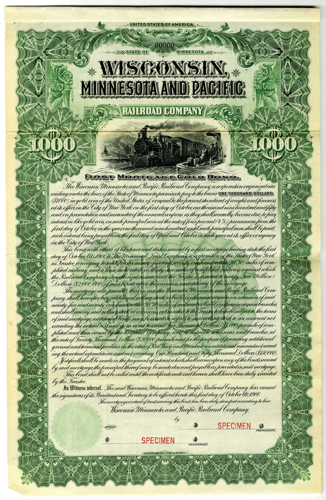 Minnesota, 1900. $1000 Specimen 4% First Mortgage Gold Coupon Bond, Black text with ornate green border and undertint, Train passing by a busy platform at top center. Red specimen overprints and POCs. Fine condition, FLBN. Only known as a specimen in Cox, no issued examples known.
