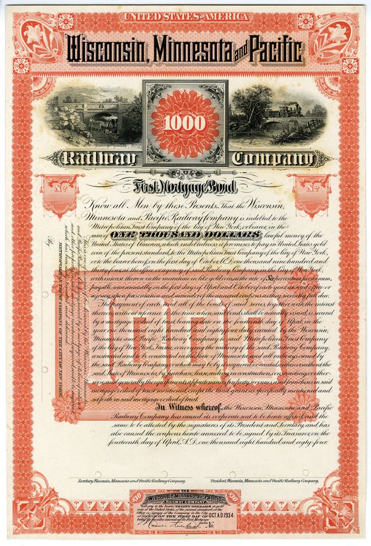 Minnesota, 1884. $1000 Proof 6% First Mortgage Bond, Black text with red-orange border and underprint, Pair of railroad scenes flank denomination at top center. Printed on india paper, POCs (not entirely punched-out), Printed on thick cardstock, Blank back. XF condition with some toning, ABNC. Rare proof in Cox.