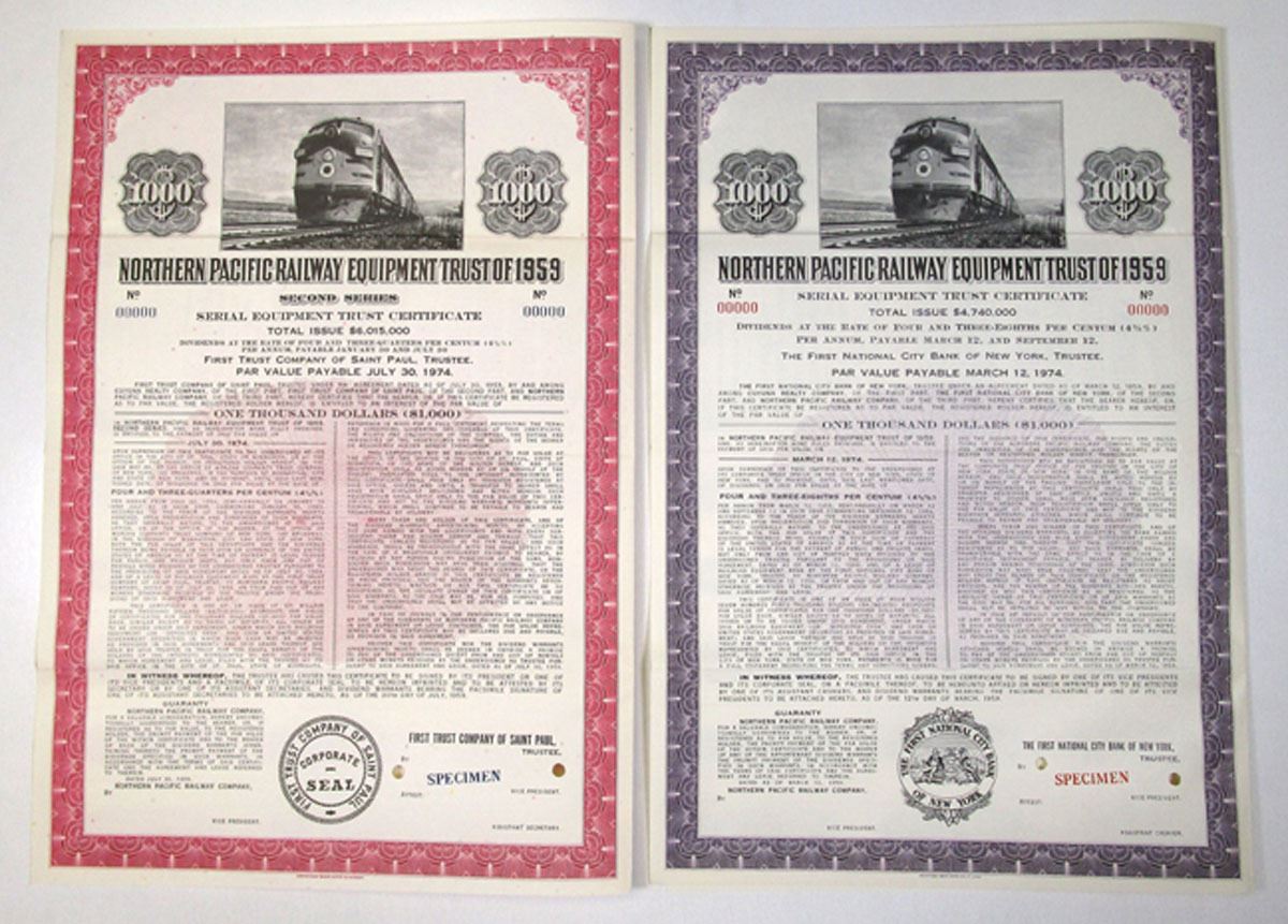 Wisconsin, 1959. Specimen Coupon Bond Pair, both are $1000 Serial Equipment Trust Certificates, including: 4.75% with red border; and 4 3/8% with purple border, both featuring same vignette of approaching steamliner. Both have specimen overprints, 00000 serial numbers, and POCs. XF to Unc condition. ABNC. Red bond is Unlisted in Cox. (2). Sold "AS IS" No returns accepted.