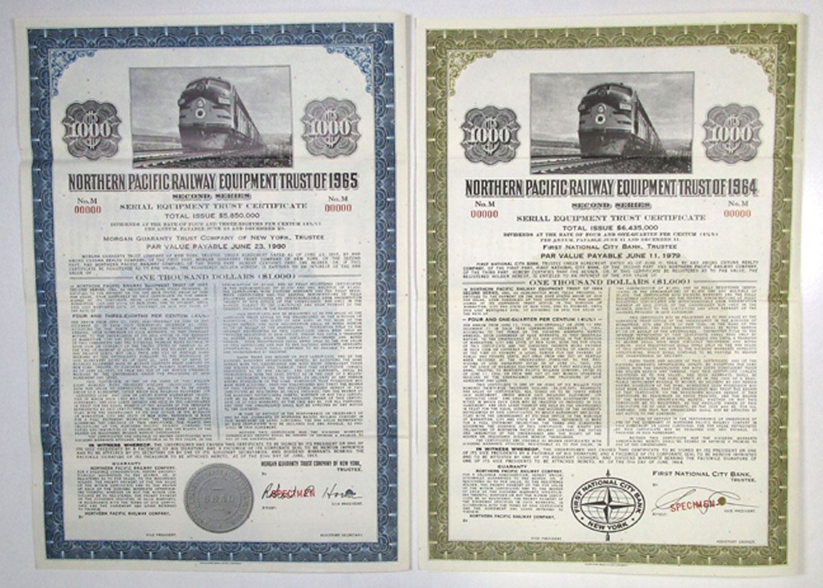 Wisconsin, 1964 and 1965. Lot of 2 Specimen Coupon Bonds, both are $1000 Serial Equipment Trust Certificates, Second Series, including: 4.25% with olive border; and 4 3/8% with blue border, both featuring same vignette of approaching steamliner train at top center. Both with red specimen overprints, 00000 serial numbers, and POCs. XF to Unc condition. ABNC. (2). Sold "AS IS" No returns accepted. Blue bond is Unlisted in Cox.
