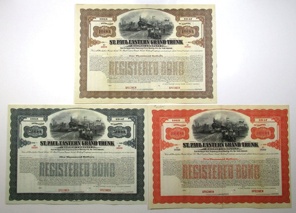Wisconsin, 1913. Lot of 3 Registered 4 1/2% Gold Specimen Bonds, Includes $1000 in Brown, $5000 in Blue and $10,000 in Orange. Bonds all have Specimen overprints, POCs, all are in VF to XF condition, ABNC. (3). Sold "AS IS" no returns accepted.