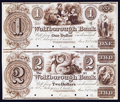 Wolfborough, New Hampshire, 1839, $1-$2, Plate C-B, NH-350-G6a -G24a, Unlisted in census, Unlisted Color, Proof / Specimen banknote pair, Banknotes are on thin banknote paper printed in brown, Choice AU to Uncirculated. Rawdon, Wright & Hatch New York imprint. (Silver City Collection, Part 2)