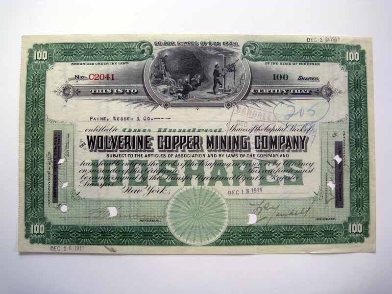 Michigan, 1919, Issued and Cancelled Stock, #C2041, 100 Shares, Black on green border and underprint, Mining vignette top center, POC's and Cancelled hand stamp, VF condition, FLBNC.