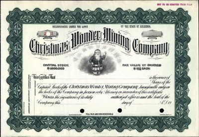 19--, ca.1900's-20's. Odd Shares. Specimen stock certificate. Purple "Not to be Removed From File" and POC's. Vignette of Santa Claus waving. "Mines Located at Wonder, Nevada". Choice uncirculated condition. Unique in archive. SBNC.