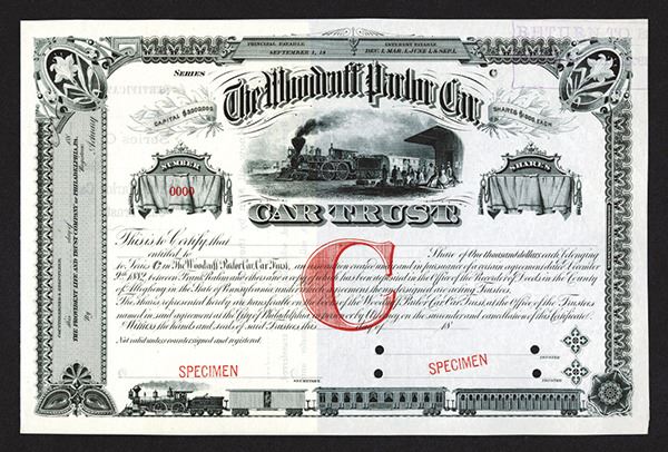 Pennsylvania. 18-- (ca.1880-1890's). Specimen stock. Odd Shares. Series "C". Black border and red "C" undertint. Locomotive at station on top with ornate small train with one Parlor car in middle on bottom margin. Red specimen overprint and POC. ABNC. XF condition. Attractive and rare stock certificate. Unlisted variety in Cox.