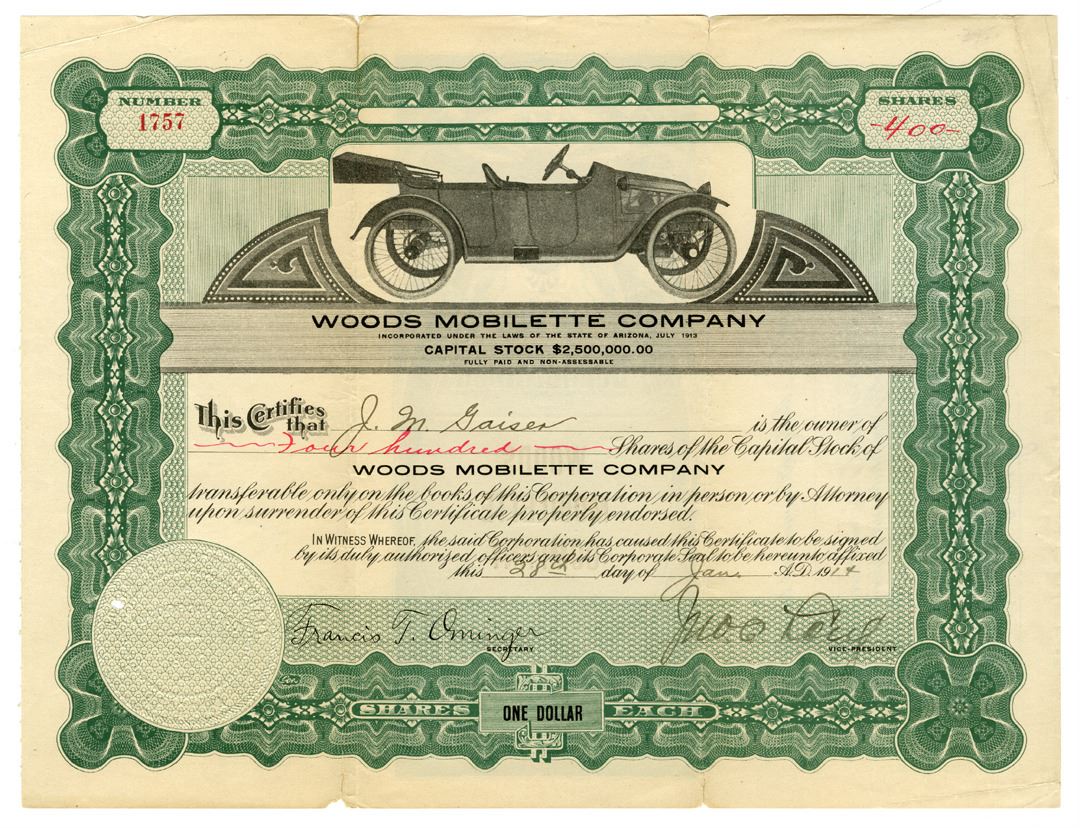 Arizona. 400 Shares Capital Stock I/U Certificate, Black print on green border, Old Woods automobile in profile at top, VF condition with archival reinforced splitting at fold lines, Goes.