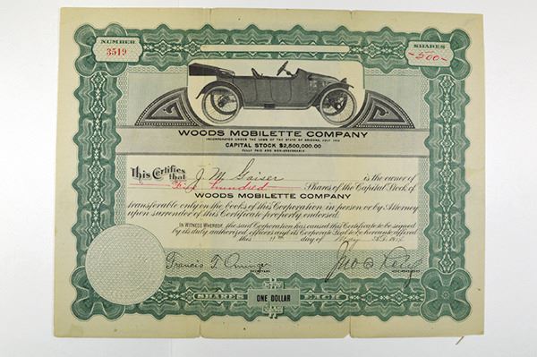 AZ. 500 Shrs Stock Certificate. Issued. Uncancelled. Light paper separation at folds. Nice early auto image at top center. VF.