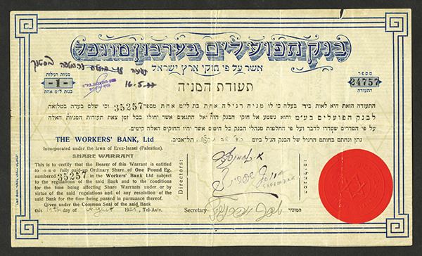 Palestine. Warrant for one ordinary share. Simple blue border with red seal of bank in the lower right corner. I/U, VF condition. Scarce.