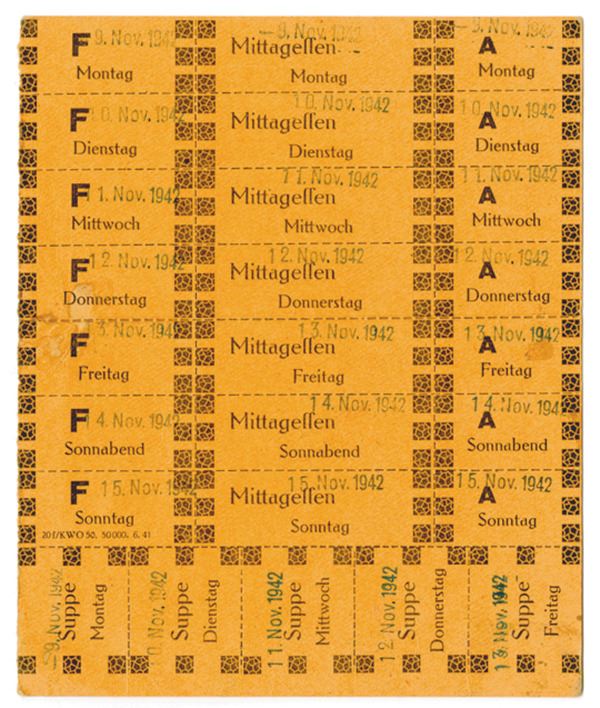 Germany, Ration cards issued to slave laborers for the week of November 9-15, 1942. These tickets were given to special technicians that due to their skills were taken out of the labor camps and stated in barracks which were located near the AEG Cable plant in Berlin (as noted on the reverse of the tickets). There are 26 coupons, 7 for each meal and 5 coupons for soup. All coupons are in tact and are in VF-XF condition.
