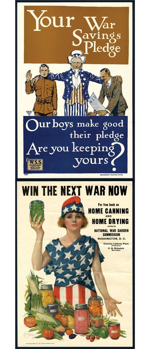 Lot of 2 posters, Includes "Your War Savings Pledge", VF with a 1 inch tear on the lower left side border; and, "Win the Next War NowÉ.Home Canning and Home DryingÉ", colorful poster with Liberty wearing American flag with canned and bottled vegetables and fruits. VF with light folds.