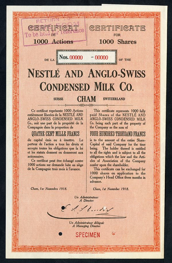 Cham, Switzerland. Red border and full tint, Specimen for 1000 shares, ABNC, EF. One of a series of only 20 Evidentiary Certificates temporarily taking the place of 20 original share certificates until "the resumption of safe transportation of valuable mail matter....now interrupted by the war." Very unusual, and with only 20 issued examples, rare.