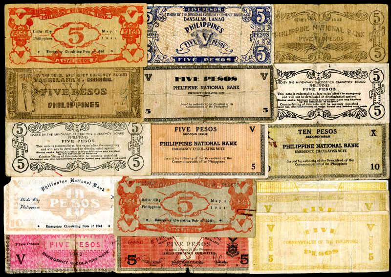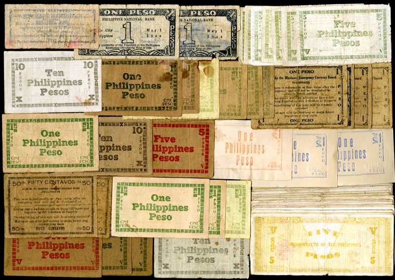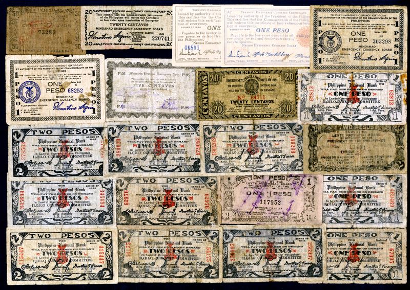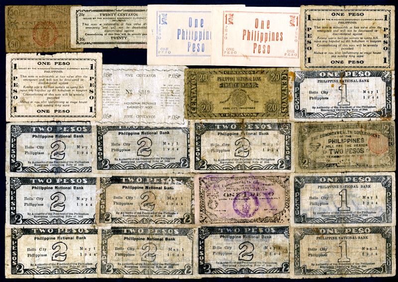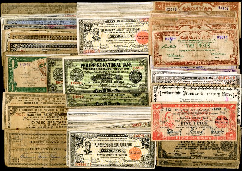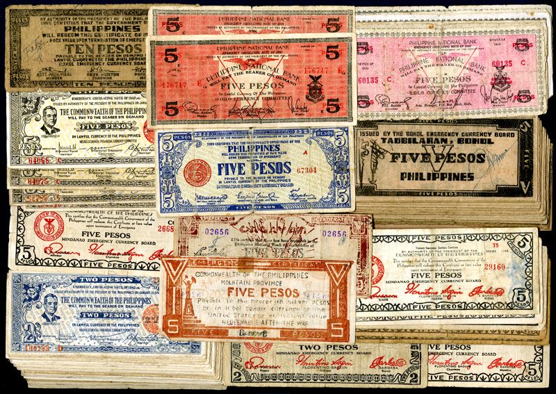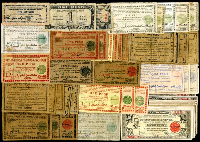 Philippines. Issues Include: Mindanao Emergency Currency Board; Mountain Province; Philippine National Bank; Negros Emergency Currency Board, Leyte Provincial Board; Iloilo Currency Committee; Bohol Emergency Currency Board, and others. Mostly Good or a bit better. Edge and separation issues associated with grade. Over 225 pieces.