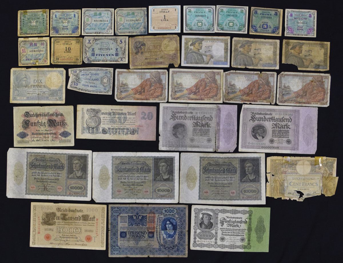 World Wide, 1910-ND (1945). Lot of 35 Issued Banknotes from Germany, France, and Allied Occupied Territories, Includes: Reichsbanknote, 1910, 1000 Mark, P-44b; 1922, 10,000 Mark, P-70 (3); 1922, 50,000 Mark, P-79; 1923, 100,000 Mark, P-83 (2); 1923, 20 Millionen Mark, P-97b; State Loan Currency Note, 50 Mark, P-49b; Oesterreichisch-Ungarischen Bank Kassenschein, ND (1919 - Old date 1902), 1000 Kronen, P-59; Banque de France, 1939, 5 Francs, P-83; 1939, 10 Francs, P-84; 1938, 100 Francs, P-86b; 1942-47, 10 Francs, P-99 (3); 1942-44, 20 Francs, P-100 (4); Allied Military Currency - Germany, 1944, 2 Francs, P-114 (2); 1944, 5 Francs, P-115; Allied Occupation of Germany, 1944, 1/2 Mark, P-191; 1944, 1 Mark, P-192; 1944, 5 Mark, P-193; 1944, 10 Mark, P-194; Allied Military Currency - Italy, 1943, 1 Lire, P-M10; 1943, 10 Lire, P-M15; Allied Military Currency - Japan, ND (1945), 10 Sen, P-63; ND (1945), 50 Sen, P-65; ND (1945) 1 Yen, P-67 (3); ND (1945), 5 Yen, P-69. Notes range from Fine to XF condition. (35). Sold "AS IS" no returns accepted.