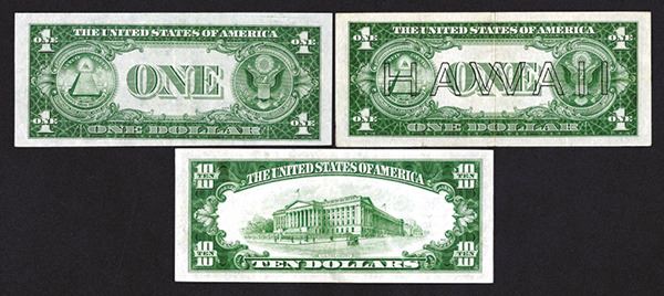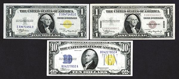 Silver Certificate. Hawaii. $1. 1935A. Fr.2300. Fine; North Africa. $1, 10. 1934A. VF+ and Fine. Nice group of wartime notes. 3 pieces.