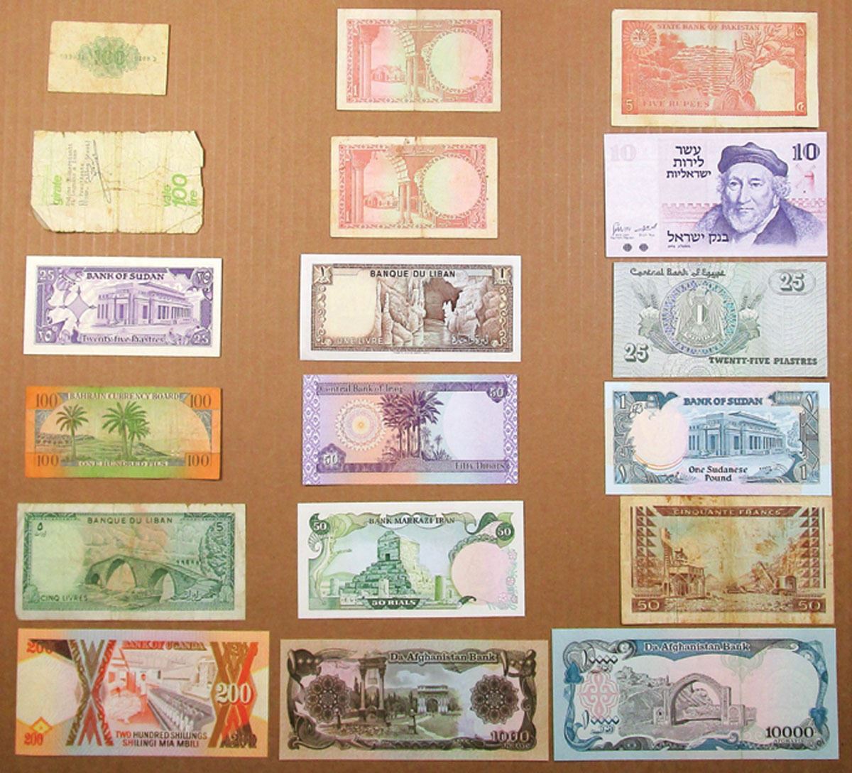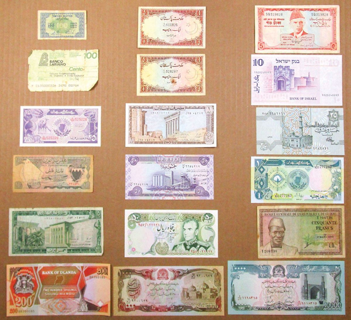 World Wide Assortment of 15+ Issued Banknotes from Israel, Sudan, Bahrain, Italy, Lebanon, Iraq, Iran, Pakistan, Egypt, Guinea, Uganda, and Afghanistan. Notes range from Fine to AU condition. (18).