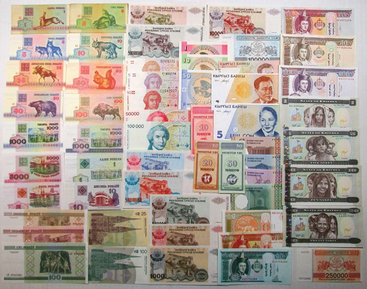 Lot of 50+ Banknotes from Various Countries, Including: Eritries, Mongolia, Croatia, Belarus, Serbia, Kyrgyzstan, Tajikistan and more. Notes range from AU to mainly CU condition or better. (50+).