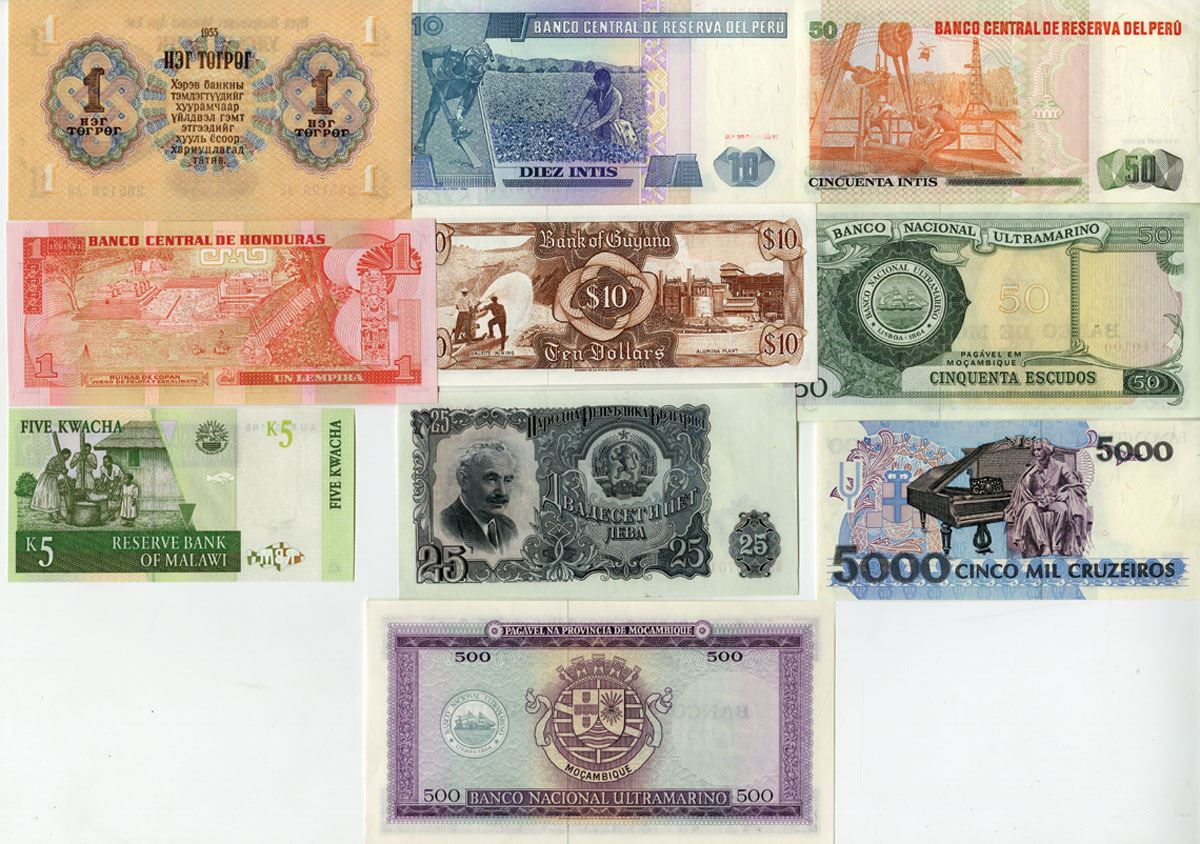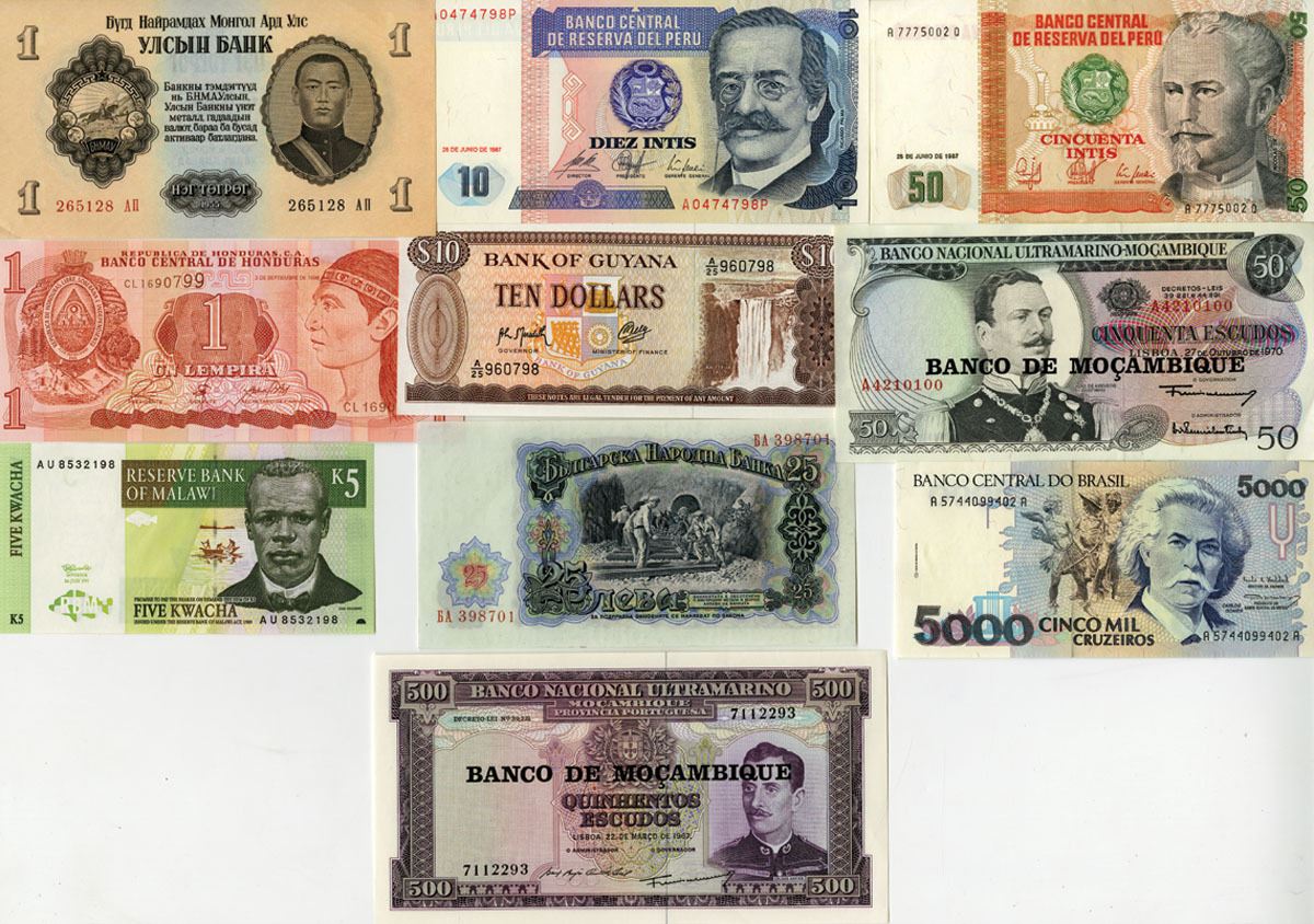 Lot of 10 Issued Banknotes from Mozambique, Brazil, Honduras, Malawi, Guyana, Russia, Peru, and Mongolia. Notes range from AU to UNC condition. (10).