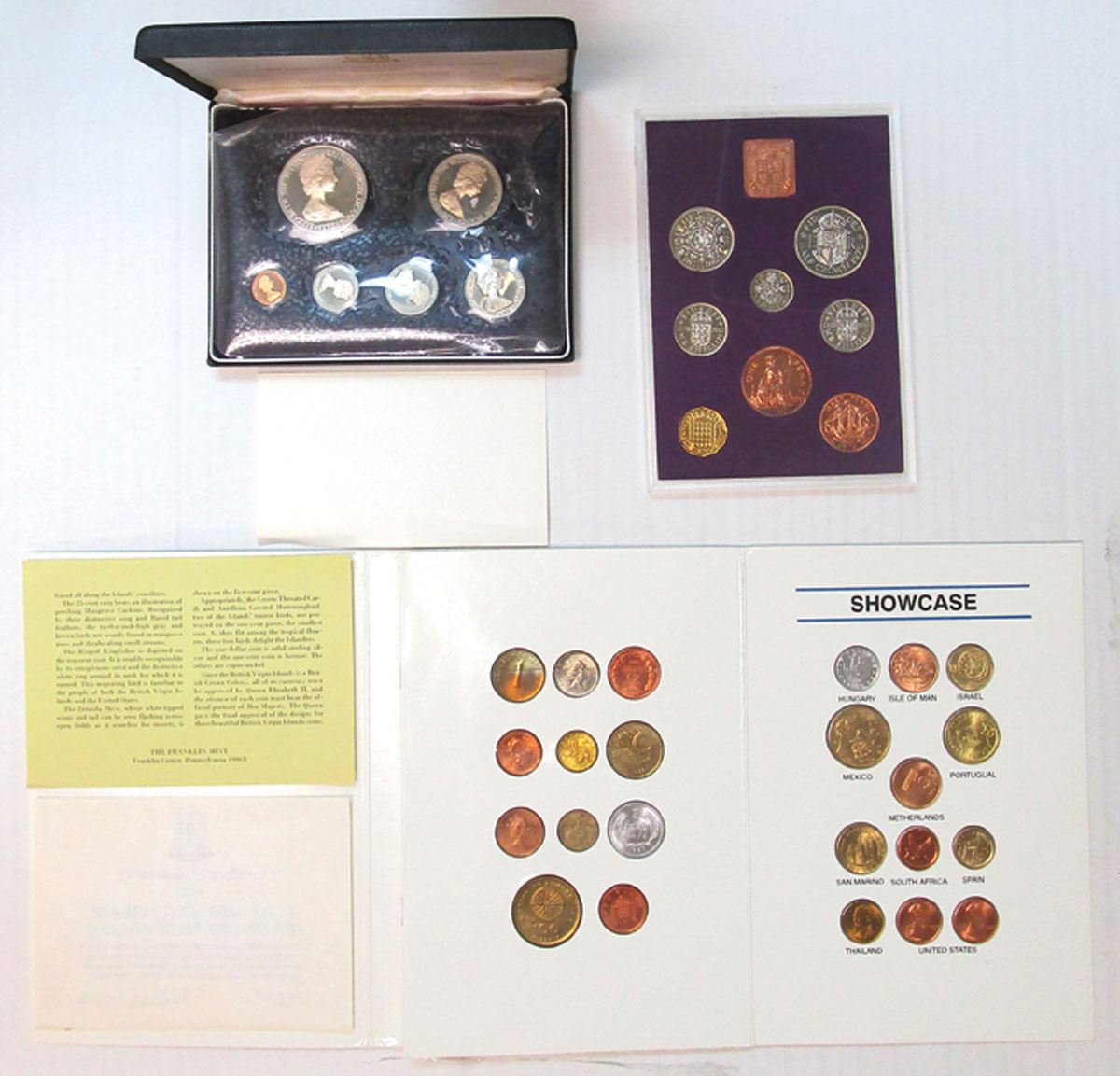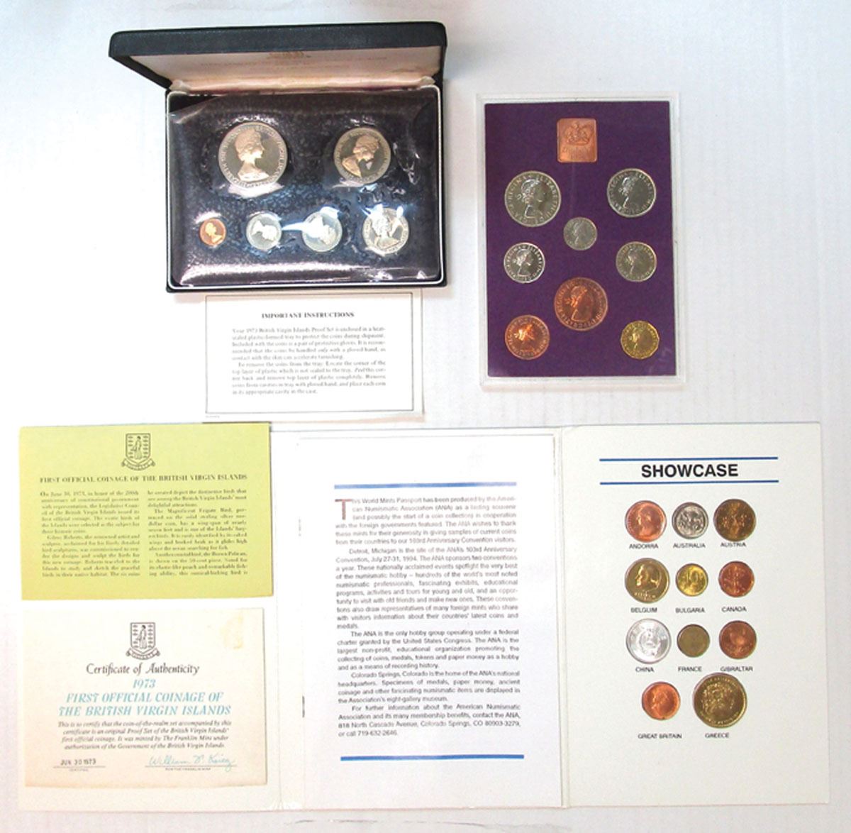 Coin Proof Sets, Includes: Coinage of Great Britian and Northern Ireland Proof Set, 1970; First Coinage of the British Virgin Islands Proof Set, 1973, includes silver coins; and World Mints Passport from ANA 1994 Coin Show with 23 coins from various different countries. Coins are all Uncirculated condition. (38). Sold "AS IS" no returns accepted.
