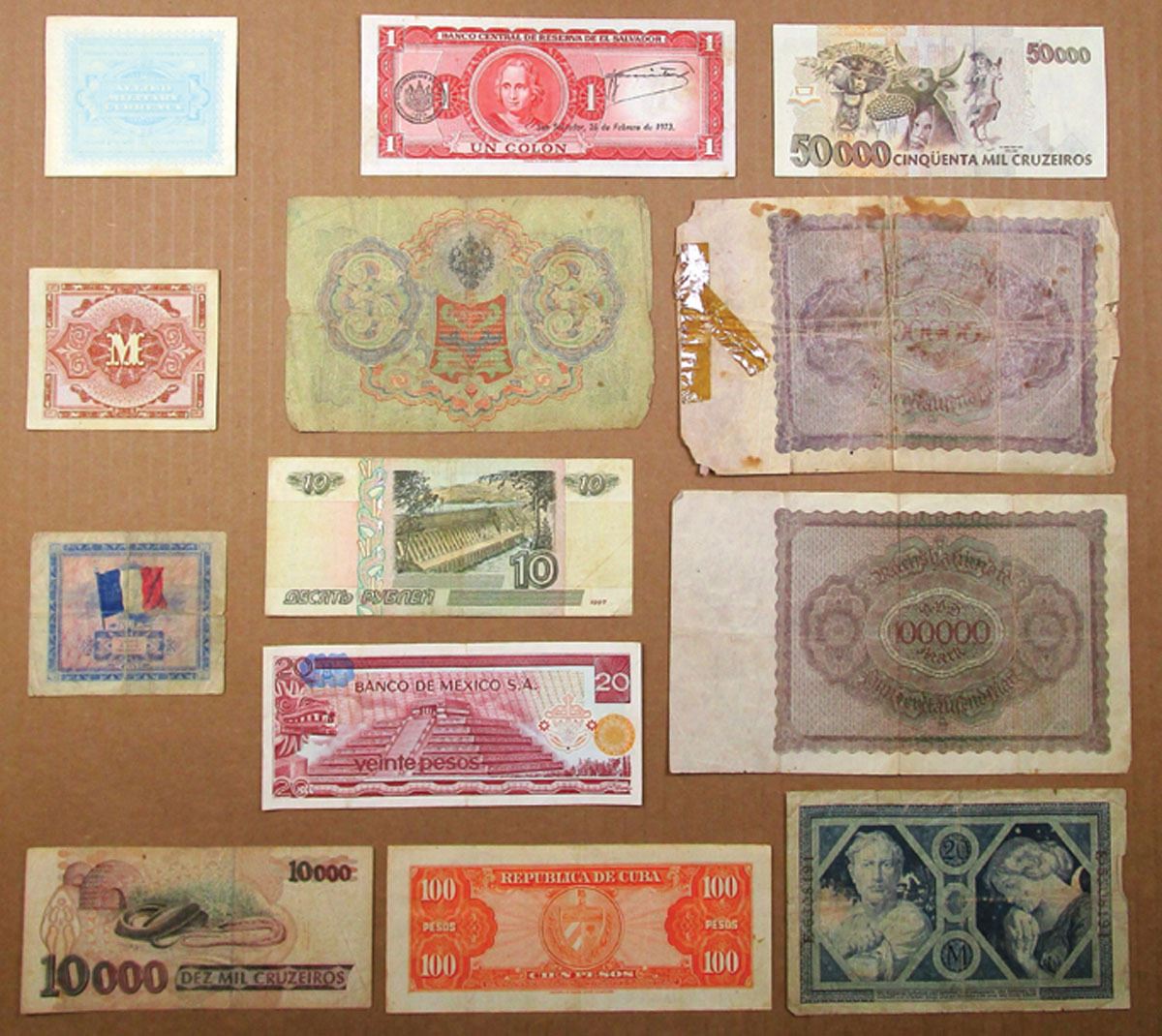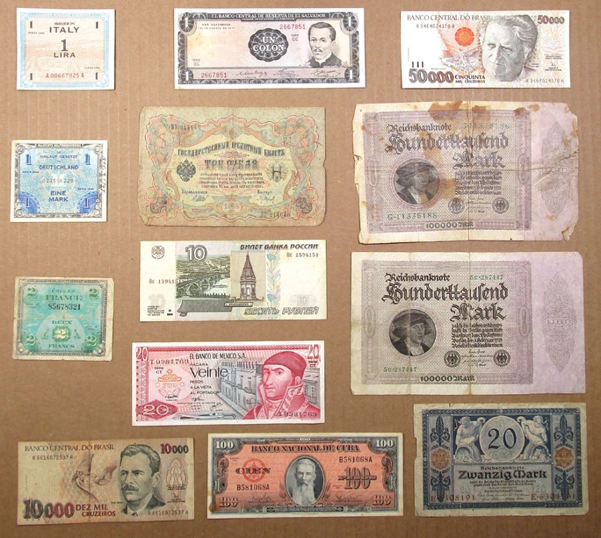 World Wide Assortment of Issued Banknotes from Italy, France, Germany, Mexico, Cuba, Brazil, Russia, and El Salvador. Notes range from Fine to VF+ condition. (13).