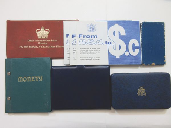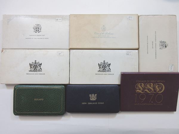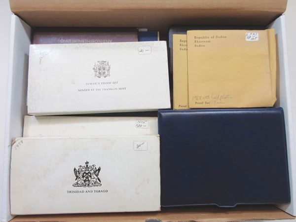 Austria 1960s set of 5 different BU 100 Shillings. Bahamas 1970 9-Piece Proof Set; Barbados 1973 8-Piece Proof Set; Great Britain 1970 8-Piece Proof Set; 80th Birthday Queen Mother Crown and Stamp set; Ireland 8-Piece Uncirculated set in a green case with gold lettering, nicely toned; Jamaica 1962 7-Piece Proof Set; Three New Zealand 1967 souvenir sets of decimal coins and 1968 6-Piece Mint Set; Sudan 1967 and 1968 Proof Set; Thailand 10-Piece Royal Mint Set; Trinidad 1971 7-Piece Proof Set, 1974 8-Piece Proof Set and 1975 8-Piece Proof Set; Also included are 30 Polish 50 Zlotych and a 20 Zlotych, all BU, 1979-1980s, and six different British Virgin Islands 1973 First Day covers with coins. Please inspect, sold "As is" No returns accepted.