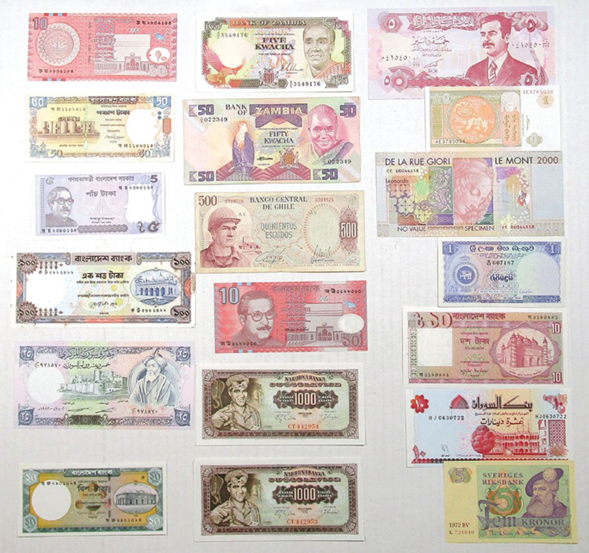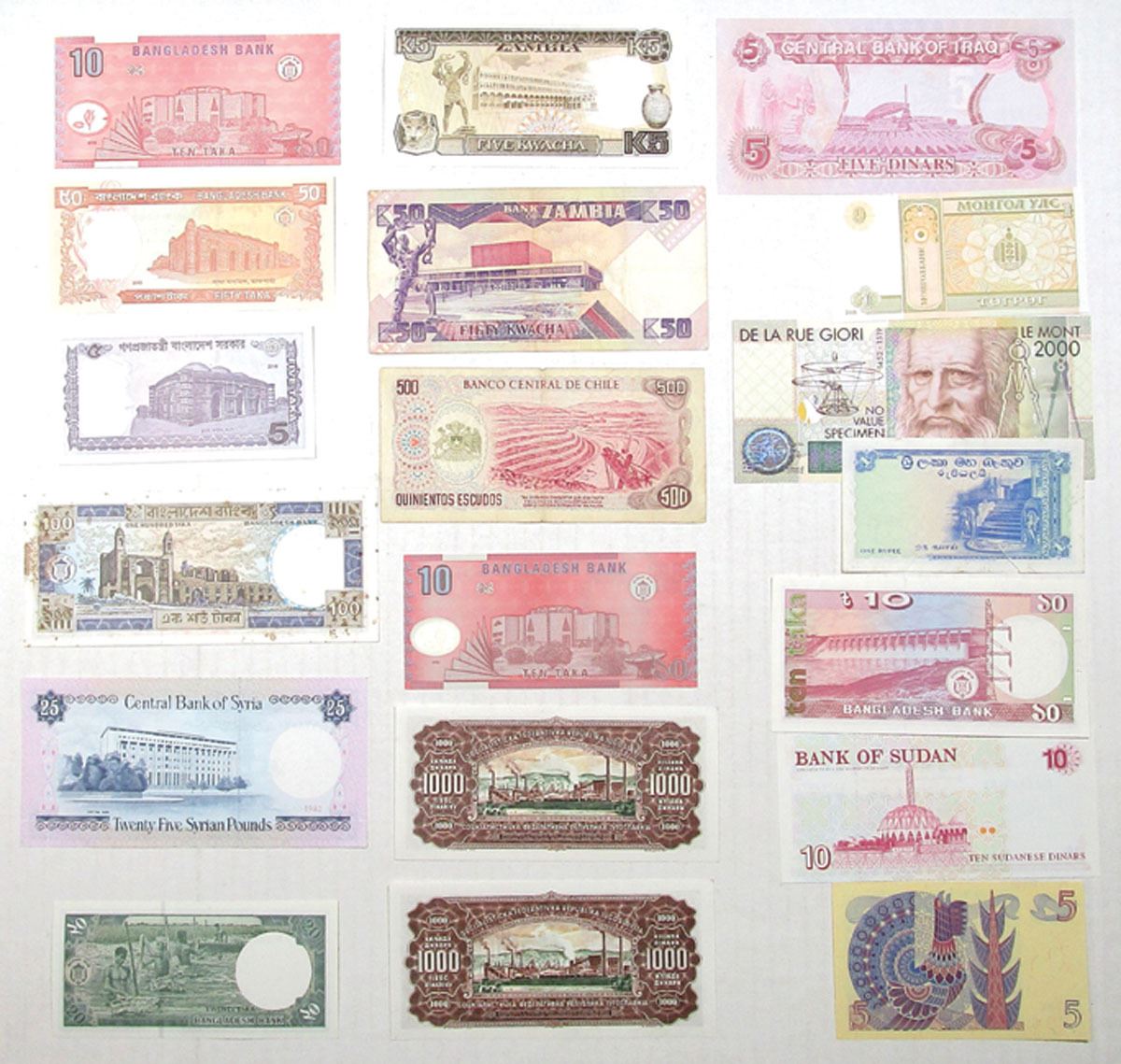 1950-2000, Lot of 19 Banknotes from Various Countries, Includes: Bangladesh, Ceylon, Chile, Iraq, Mongolia, Sudan, Sweden, Syria, United Kingdom (Giori Test Note), Yugoslavia, and Zambia. Banknotes range from VF to CU condition. (19). Sold "AS IS" no returns accepted.