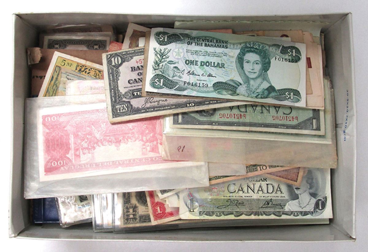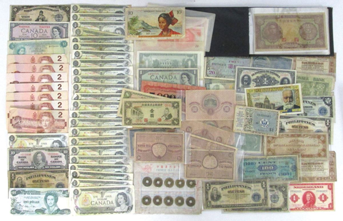 World Wide Assortment........, Issued Banknotes from Canada, Bahamas, Denmark, Czecheslovakia, Paraguay, Philippines, China, Belgium, Netherlands, Germany, France, Mexico, Allied Military Currency WWII, Japan and many more. Lot also includes Chinese old coins. 100+. Sold "AS IS" no returns accepted.