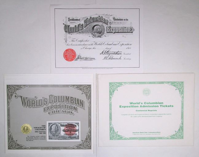 ABNC 1992, Set of 6 Intaglio Reprinted tickets from the World's Columbian Exposition with Envelope and Litho "Certificate of Visitation, Includes: Card with portraits of Columbus; Abraham Lincoln; George Washington; George Friedrich Handel; Benjamin Franklin; Native American Chieftain. All are in CU condition. (7). Sold "AS IS" no returns accepted.