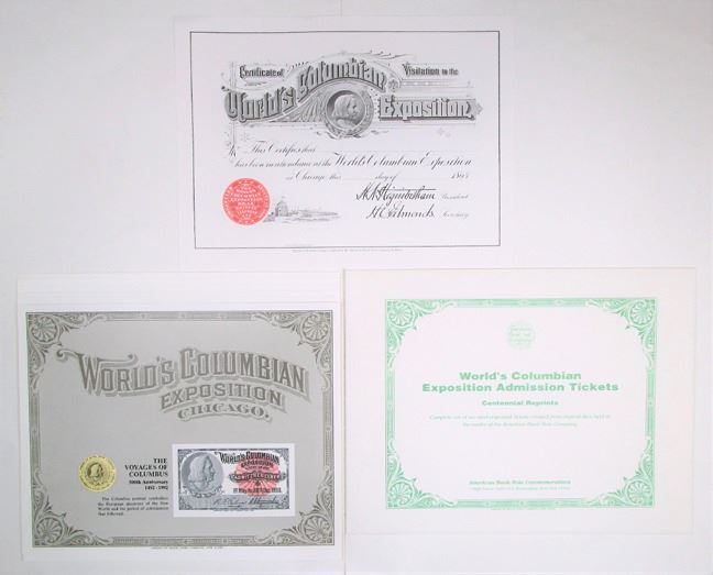 ABNC 1992, Set of 6 Intaglio Reprinted tickets from the World's Columbian Exposition with Envelope and Litho "Certificate of Visitation, Includes: Card with portraits of Columbus; Abraham Lincoln; George Washington; George Friedrich Handel; Benjamin Franklin; Native American Chieftain. All are in CU condition. (7). Sold "AS IS" no returns accepted.