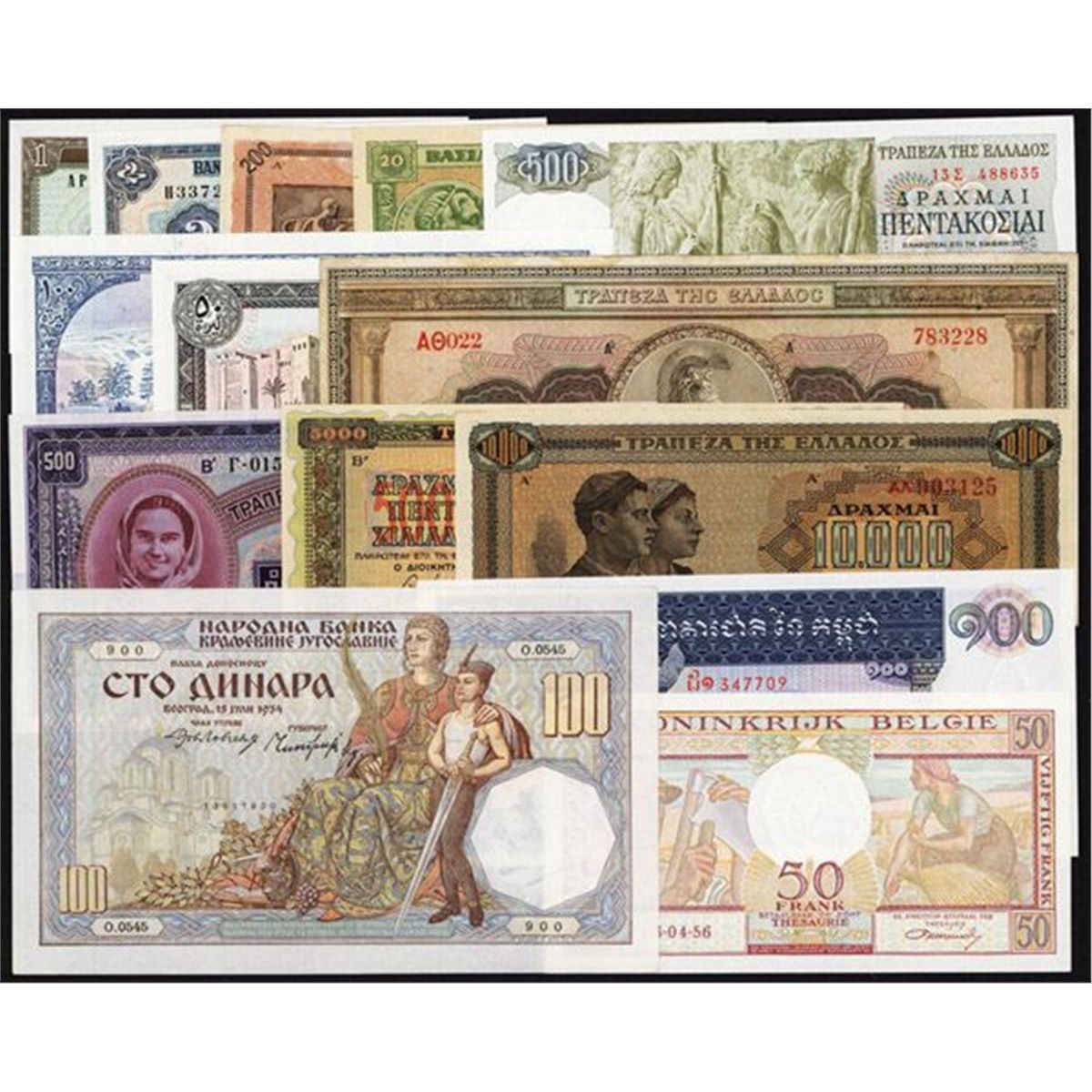Lot of 14 worldwide notes, Includes Yugoslavia, 1934, 100 Dinara, P-31, AU-Unc.; Haiti, 1990, 1 & 2 Gourdes, P--253, P-254; Greece, 7 different WW II Inflation issues; Lebanon, 2 modern issues; Belgium, 1956, 50 Francs and Cambodia, all are in AU to Unc. mostly low priced notes.