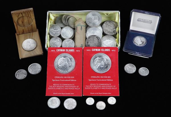 Over 60 Silver Coins from the Netherlands, France, Austria, Germany and others. Silver value varies per issue. The lot includes over $700 of Bullion silver value 0.7 to 0.9 silver. Most of the coins are in Uncirculated to CU condition. Not checked for dates or varieties. Also includes a France, 1960, 1 Franc Roll of 40 coins; a pair of 1972, Sterling Silver, Cayman Islands, $25 Specimen Uncirculated coins struck by the Royal Canadian Mint; and, a group of 6 Spain, 1957, 25 and 50 Pesetas coins, CU to Gem Unc. (60+). Shipping charges apply - weight 4 lbs.