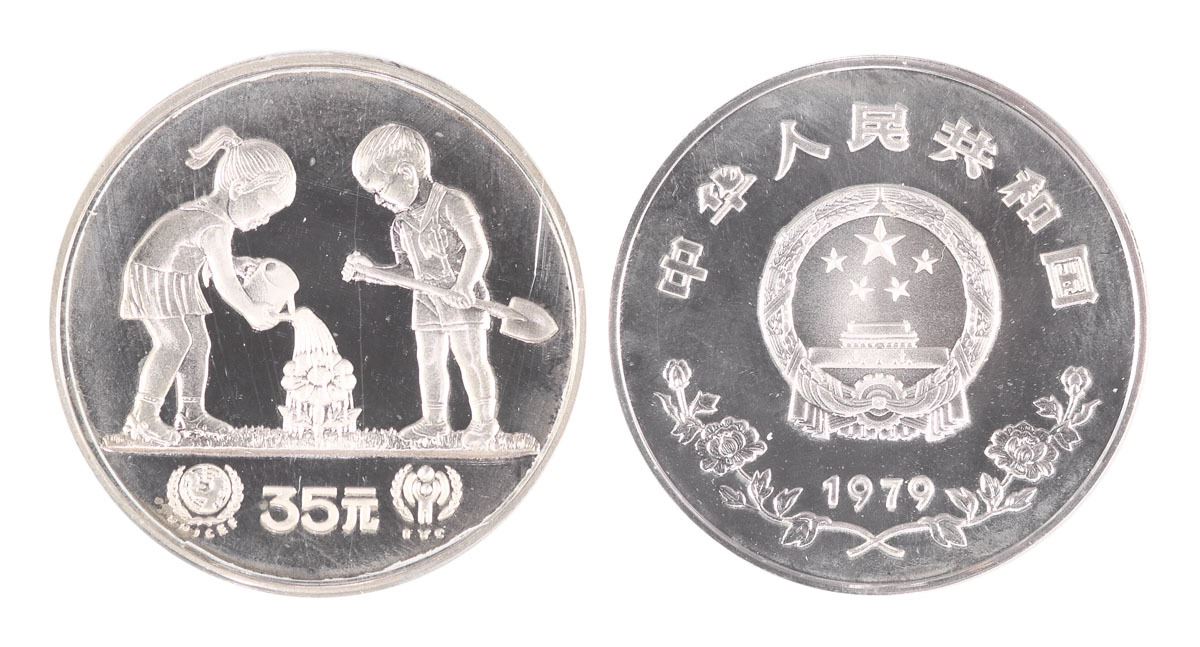 includes a 1988 Canada Winter Olympic proof set of ten different $20 silver coins in original case; nine Canadian proof sets, 1980-87 and 1990; 1979 UNICEF "International Year of the Child" silver proof set of 12 coins with coins from the U.A.E., Philippines, Netherlands Antilles, Jamaica, Maldives, Zambia, Mongolia and many others but the UNICEF collection is highlighted by China's 1979 35 Yuan (-ounce silver proof) in superb uncirculated condition; also included is a set of 11 Silver dollar-size proof medals from "De Penningen der Elf Provincien" featuring the arms of different Dutch Provinces, and Colombia "Museum of Gold" featuring 12 different silver proof medals with partial gold plating; estimated silver in this lot is 32 ounces; attractive and interesting coin lot. Shipping charges apply - weight 20 lbs. (photo on web site)