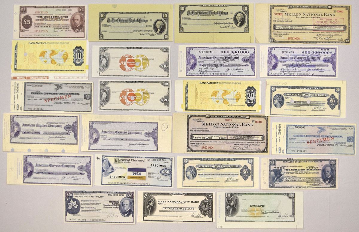 World Wide, ND (1940-90s). Lot of 23 Specimen and Proof Travelers Checks issued by various international banks and financial institutions, representing multiple denominations and currencies, Includes: Mellon National Bank, American Express Co., MasterCard, Thos. Cook & Son Ltd., First National Bank of Chicago, Citicorp., Perera Express Travel Check, BankAmerica and others, Checks have archival notations, Specimen overprints, POCs, and range from AU to UNC condition. (23). Sold "AS IS" no returns accepted.