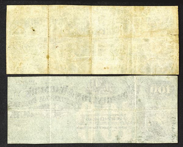 NH. 1, 100 Dollars. College Currency printed by Hatch & Co. NY. The $1 with a edge tear at left end. Fine. 2 pieces.