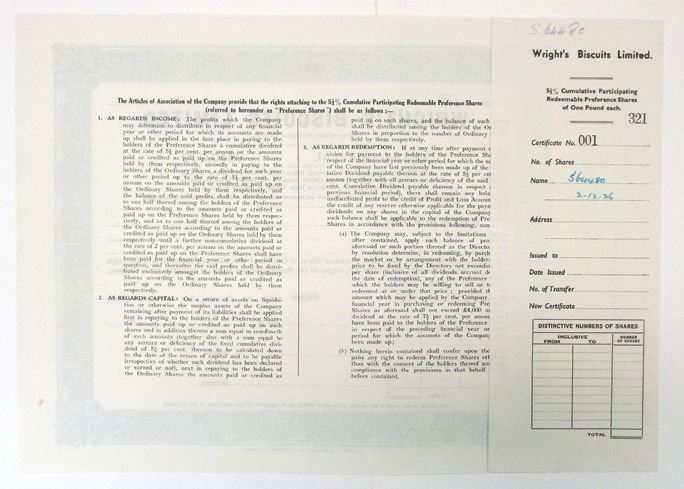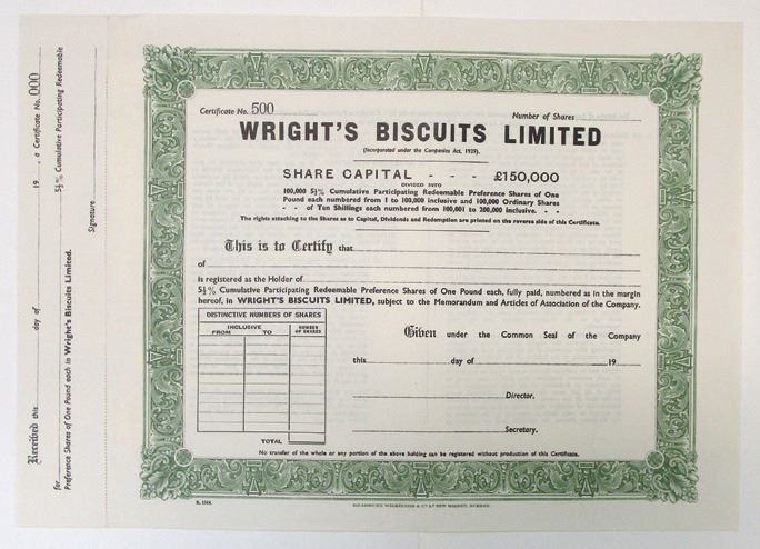 United Kingdom, 1936. Specimen 5 1/2% Cumulative Preferred Shares Certificate, Black print with green border, S/N 000-500, VF to XF condition, BWC.