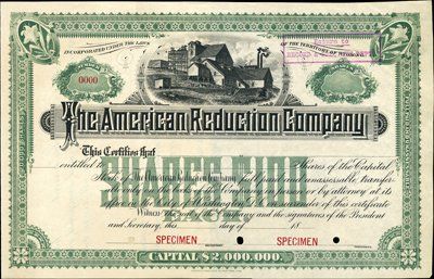 18--. Ca.1880's. Odd Shs. Specimen stock certificate. Green border. Vignette of Reduction Bank located in Pittsburgh. Red specimen overprints, POC's and "00000" serial numbers. XF condition. Early and scarce Wyoming Territory mining related stock certificate. XF condition. ABNC.