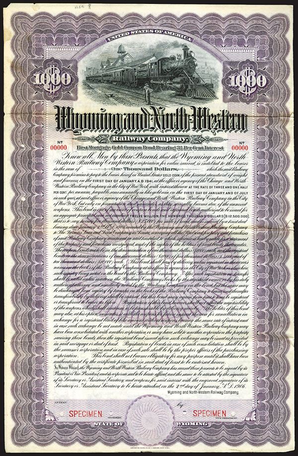 Wyoming, Specimen 1st Mortgage 3-1/2% Gold Coupon bond. Purple border. Speeding locomotive leaving station. VG condition with minor toning and small splits at folds, coupons almost separated from bond. Red specimen overprints and POC's. Rare and attractive bond and possibly the only one available. This is the example listed in Cox. Rare western bond. ABNC.